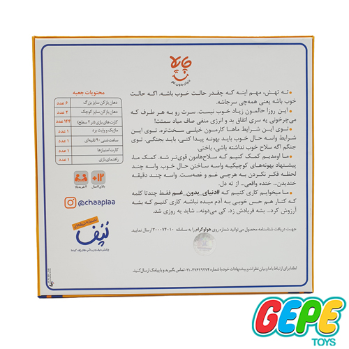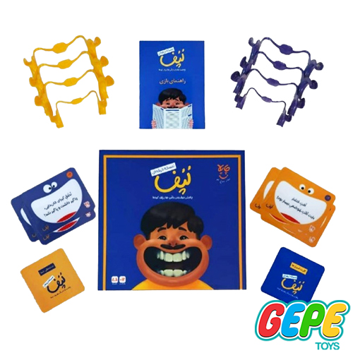 - محتویات جعبه: دهان باز کن سایز بزرگ 6 عدد، دهان باز کن سایز کوچک 2 عدد، کارت بازی در 2 سطح 144 عدد، ماژیک وایت برد یک عدد، ساعت شنی 90 ثانیه ای یک عدد، کارت امتیاز