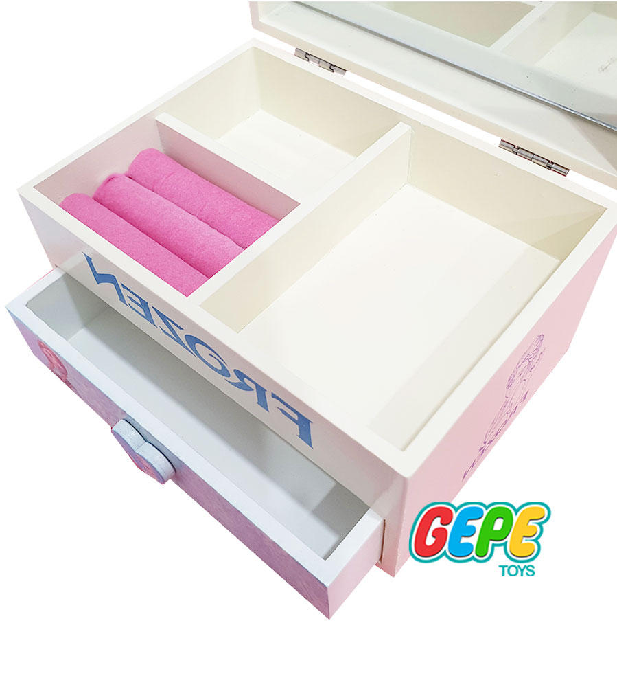 این جعبه چوبی دارای فضاهای مجزا برای قرار گرفتن انواع وسایل دخترانه، اکسسوری ها، جواهرات و… هست. همچنین یه آینه هم داره که این آینه جعبه رو به یه آیتم کامل تبدیل میکنه. اگه کودک شما به انیمیشن فروزن و کاراکترهای اون علاقه منده، این محصول یه انتخاب عالی و هیجان انگیز برای اونه. کشوهایی که برای جعبه چوبی فروزن مدل 029 تعبیه شدن، استفاده از این محصول رو راحت تر و لذت بخش تر میکنن!