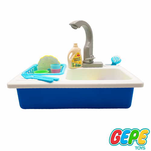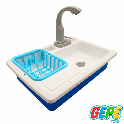 این سینک ظرفشویی یه مخزن پلاستیکی برای نگهداری آب، تعدادی ظروف و یه شیر آب داره که با کمک باتری روشن میشه و آب درون مخزن رو به بیرون پمپاژ میکنه و کودک میتونه ظروفش رو بشوره و در آبچکان قرار بده.